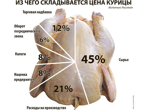 Если представить эти значения в денежном эквиваленте, то на примере курицы при средней стоимости 133 рубля за килограмм структура розничной цены будет выглядеть так: себестоимость — 87,5 рубля, наценка производителя — 10 рублей, налоги — 8 рублей и наценка розницы — 27,5 рубля.