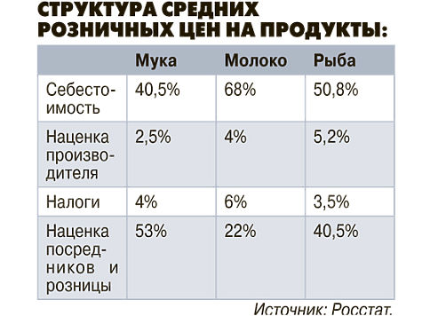 Однако даже самые низкие цены в ретейле гораздо выше той стоимости, по которой продукты отпускаются с предприятий, — на этой разнице и зарабатывает свою «копеечку» розница. В докладе «Как формируются цены и качество продтоваров (взгляд потребителя)», подготовленном Союзом потребителей России, содержатся данные о долях расходов на производство, наценки посредников и прибыли организации розничной торговли в конечной цене разных продуктов. Так, себестоимость хлеба составляет 37% от цены, молока — 27%, мороженой рыбы — 24%, подсолнечного масла и мясных продуктов — не более 10%. Посредники прибавляют к цене муки, из которой делается хлеб, еще 25–30%, подсолнечного масла — 27%, рыбы — 20–23%, макаронных изделий — 19%, сахара — 16%. Наконец, магазин делает наценку от 20 до 50%, а от реализации макаронных изделий получает 9% чистой прибыли, рыбы — 7–10%, молока, подсолнечного масла, яиц, сахара, муки — около 6%. Отметим, все эти цифры актуальны для продуктов отечественного производства, которые не ввозятся на территорию России импортом.