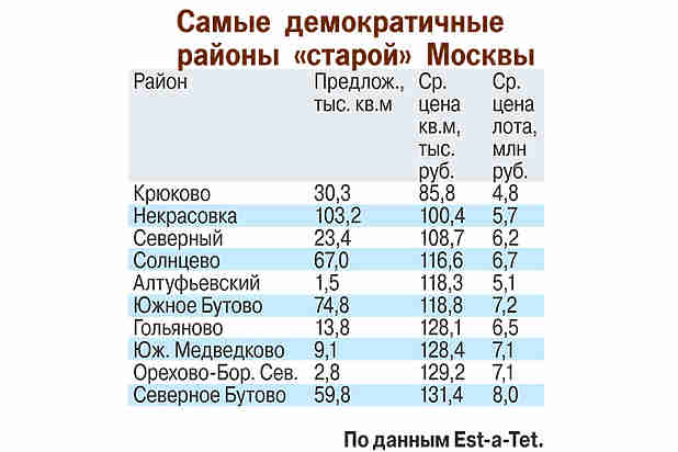 По оценке руководителя по работе с ключевыми партнерами Est-a-Tet Романа Родионцева, самые демократичные по цене квадратные метры сегодня продаются в Зеленограде, в районе Крюково. Здесь реализуются сразу два крупных проекта с общим объемом предложения 30,3 тыс. кв.м. На втором месте оказалась Некрасовка, в которой продается 103,2 тыс. кв.м. Стоит отметить, что с точки зрения объема доступного предложения этот район является абсолютным победителем (см. таблицу). Замкнул тройку самых недорогих районов Москвы район Северный, где в экономклассе реализуется три проекта с общим объемом в реализации 23,4 тыс. кв.м.