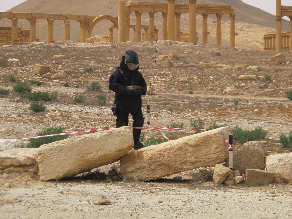 Российские специалисты Международного противоминного центра Вооруженных Сил Российской Федерации начали мероприятия по разминированию Пальмиры. В первую очередь разминируют подходы к городу.