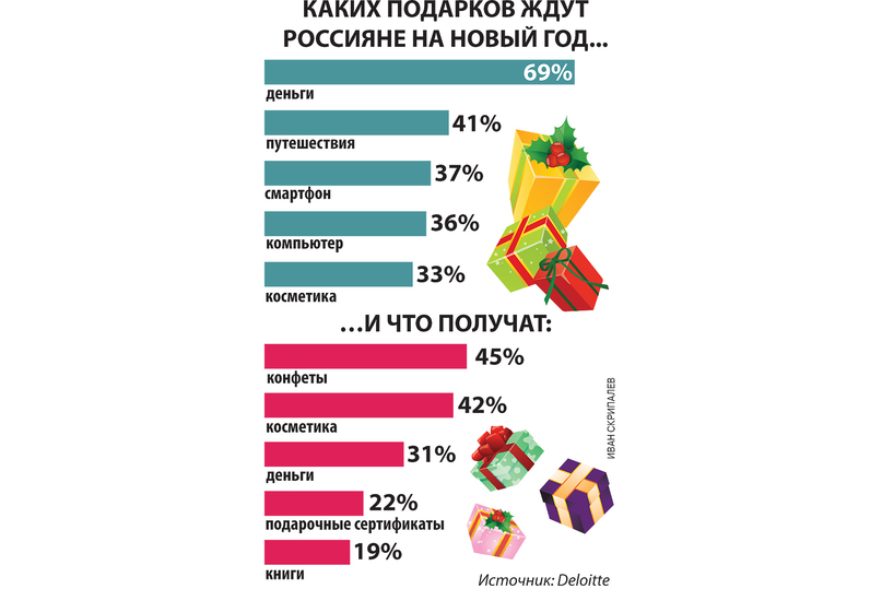 Правда, ожидания и реальность получателей новогодних подарков будут сильно отличаться: вместо денег, путешествий и гаджетов половина россиян получат от родных и близких шоколад и косметику, говорится в исследовании. Не поможет даже то, что многие (18% респондентов) просят подарить заранее выбранные товары.