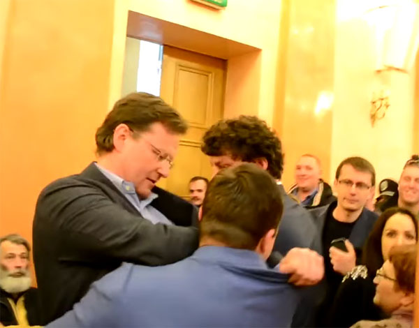 Инцидент произошел во время выступления Саши Боровика с трибуны. В своей речи вице-губернатор отметил, что на выборах мэра у него украли победу. Также он добавил, что будет жестко оппонировать представителям городской администрации.