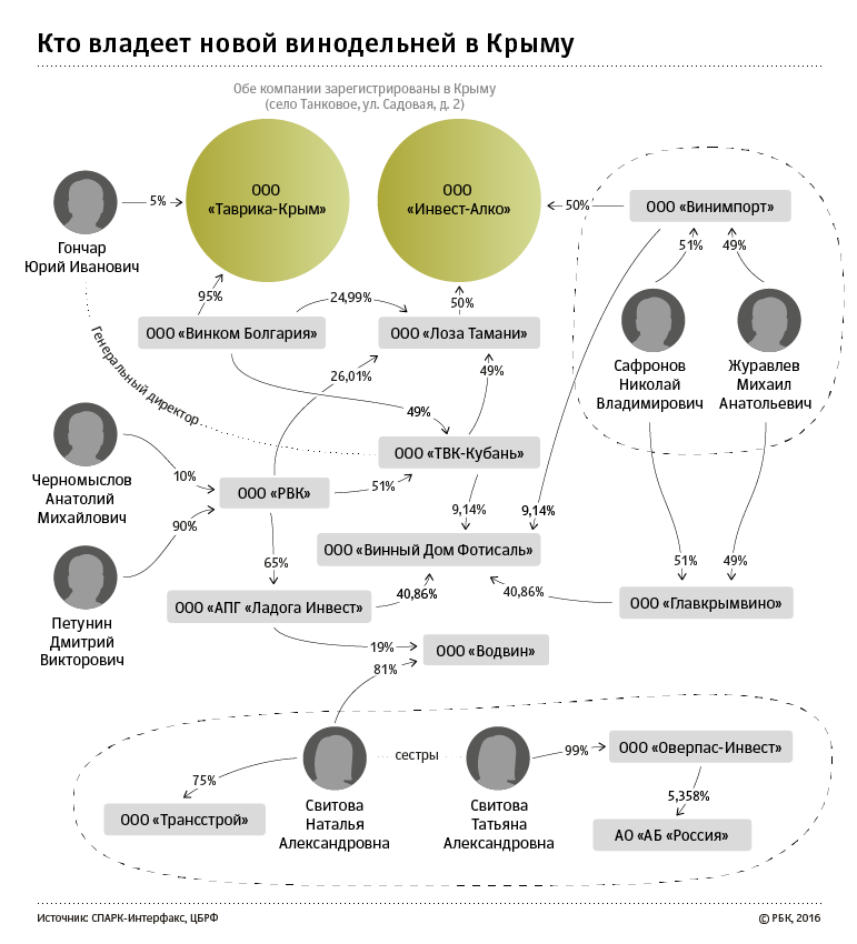 Как выяснил РБК, ООО «Инвест Алко» и ООО «Таврика-Крым» имеют фактически две группы общих совладельцев — профильные и ранее не объявлявшие о своих проектах на алкогольном рынке. Первая — это структуры дистрибьюторской группы «Агора» Николая Сафронова и Михаила Журавлева, поставщика вин знаменитого ФГУП «ПАО «Масс​​​андра» (само предприятие принадлежит Управлению делами президента РФ). Компания уже более 20 лет занимается поставками вин из Крыма (помимо «Массандры» также поставляет вина Инкерманского завода марочных вин), Грузии, Черногории, Венгрии, а также развивает сеть фирменных магазинов «Массандра». Кроме того, бизнесмены аффилированы сразу с двумя крупными предприятиями — винным домом «Фотисаль», расположенным в селе Танковое Бахчисарайского района Крыма (выпускает вина «Таврийские погреба», «Сокровища Крыма»), и винодельческим предприятием «Тавинко» в Краснодарском крае. Последнее, владеющее, по собственным данным, 480 га виноградников, занимается «возрождением традиционных российских сортов винограда». В частности, компания планирует высадку новых автохтонных (местных) сортов — «Цитронный», «Молдова», а также увеличение количества лоз винограда «Достойный», «Владимир» и «Дмитрий» (два последних сорта были выведены в 2015 году в Северо-Кавказском зональном исследовательском институте садоводства и виноградарства).