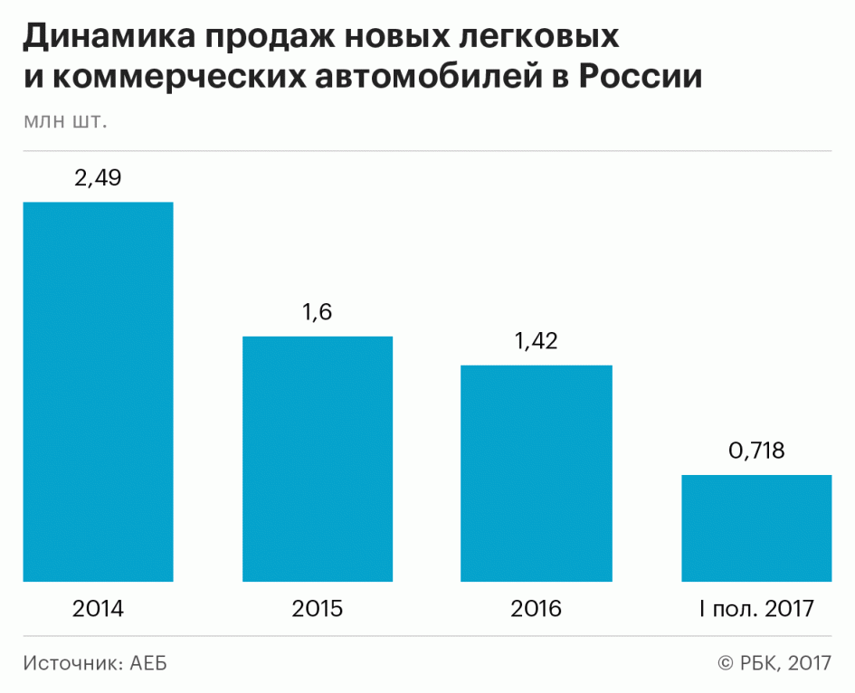 После четырех лет падения продаж новых автомобилей в первом полугодии 2017 года они выросли на 7%, достигнув 718,53 тыс. машин, сообщала Ассоциация европейского бизнеса (АЕБ). Рост рынка, в свою очередь, способствовал увеличению объемов продаж машин на один дилерский центр на 6%, до 203 шт., следует из данных РОАД. Оборот автосалонов за январь—июнь 2017-го составил почти 892 млн руб., увеличившись на 10,6%.