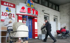 Мужчина с коляской стоит перед входом в магазин «Дети». Санкт-Петербург, 2009 год