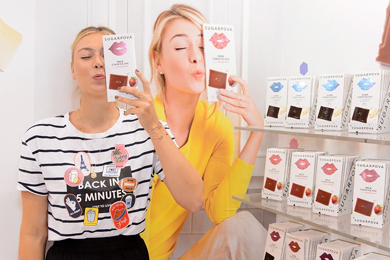 В 2012 году Мария Шарапова запустила свой бренд Sugarpova, под которым выпускает жевательные конфеты и жвачку. «У всех есть парфюмерия и линии одежды, поэтому производство конфет выглядит неожиданным шагом. А я люблю выделяться», — говорила спортсменка в интервью Forbes. На запуск бренда она потратила $500 тыс., в 2015 году было продано более 5 млн упаковок конфет Sugarpova. На фото: Шарапова со своими конфетами, май 2016 года
