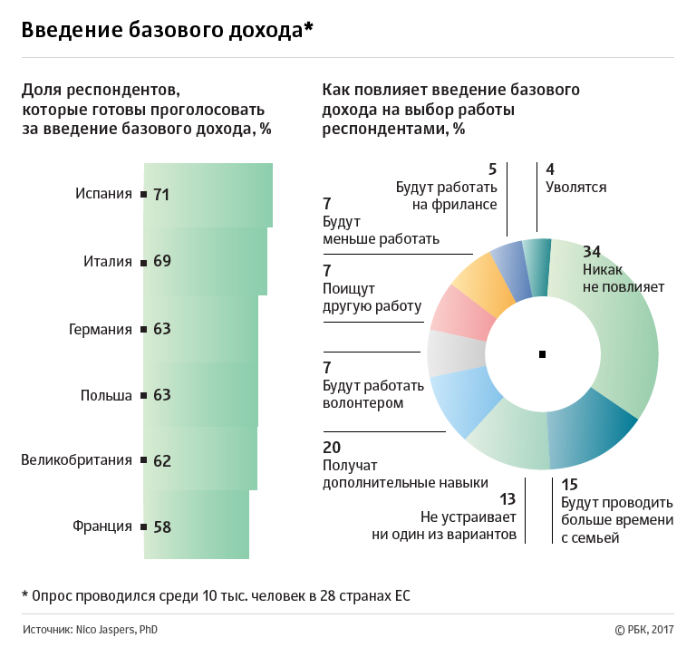 Но искать ответы на эти сложные вопросы готовы далеко не все — например, в июне 2016 года почти 80% граждан Швейцарии проголосовали на референдуме против введения безусловного дохода. Они отказались от ежемесячной выплаты от государства по 2,5 тыс. швейцарских франков (около $2,5 тыс.) каждому совершеннолетнему гражданину. Швейцарцы испугались повышения налогов и упразднения действующей системы соцобеспечения, которая и так хорошо работает.
