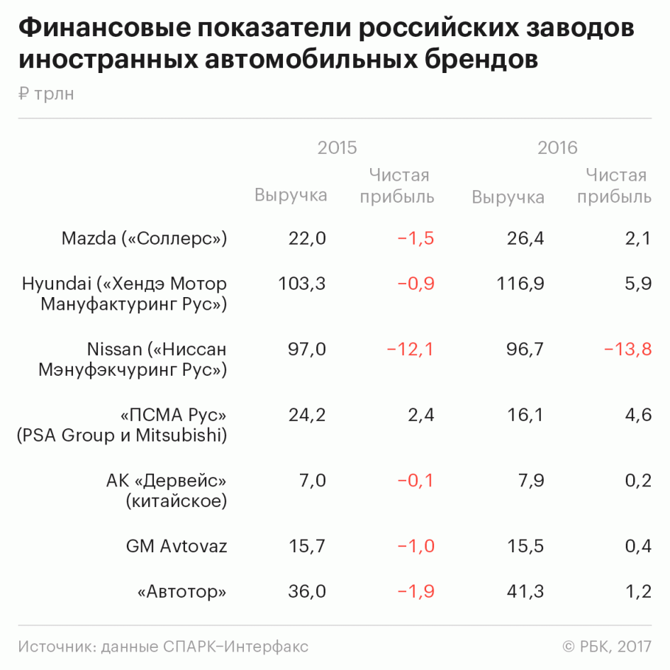 Заводы Renault (Москва), Ford (Набережные Челны, Всеволожск, Елабуга), Toyota (Санкт-Петербург) и Volkswagen (Калуга) не раскрывают финансовые результаты по российским заводам.