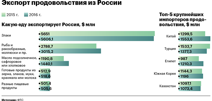 Основными потребителями российского продовольствия в 2016 году, по подсчетам Российского экспортного центра (РЭЦ), стали Китай (10,1%), Турция (9,2%), Египет (7,9%), Республика Корея (7,8%) и Казахстан (7,1%). Они же входили в пятерку крупнейших импортеров в 2015 году, но тогда лидером была Турция.