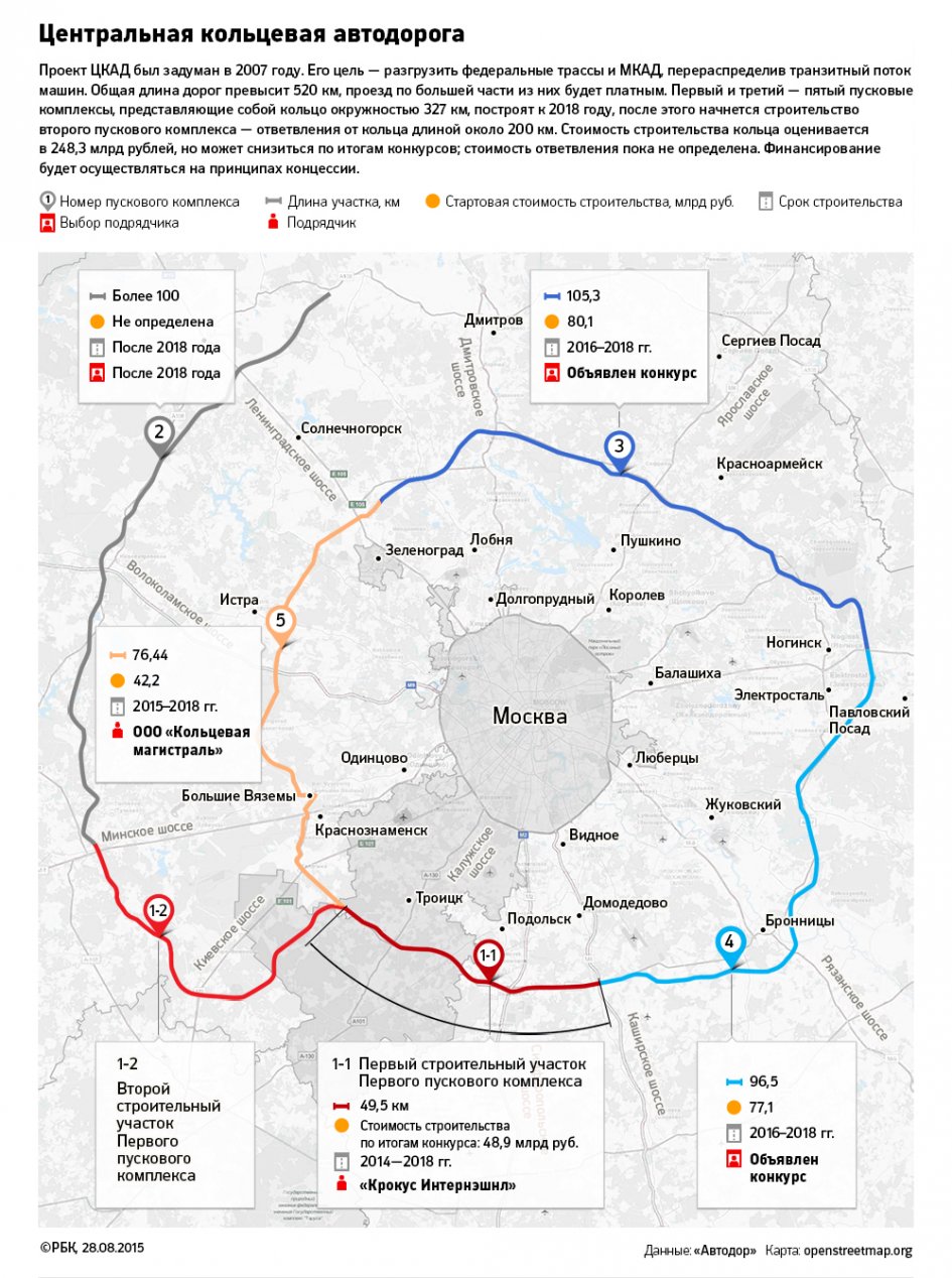 ЦКАД планируется построить к концу 2018 года. Стоимость строительства, по предварительным оценкам, составит около 300 млрд руб., из них 150 млрд руб. — средства Фонда национального благосостояния (ФНБ). Первые лоты — первую и пятую секции ЦКАД — разыграли еще в 2014 году. Их стоимость составляет 48,9 млрд руб. и 42,2 млрд руб. соответственно.