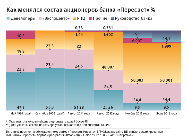 Об аффилированности заемщиков «Пересвета» с его менеджментом и акционерами впервые сообщило рейтинговое агентство Fitch в октябре 2016 года. Аналитики, изучив крупнейшие кредиты банка, указали: фактическая связь сторон может быть выше указанной в отчетности. Займы на 12 млрд руб. в Fitch посчитали высокорисковыми — их получили компании без реальных активов. Через десять дней телеканал «Дождь» сообщил об исчезновении Швеца, вскоре ЦБ ввел в «Пересвете» временную администрацию. По состоянию на начало февраля размер дыры — отрицательного капитала банка — превысил 100 млрд руб., рассказывали источники РБК. Сейчас представители банка, ЦБ и крупнейших вкладчиков и кредиторов обсуждают план спасения «Пересвета». Рабочий сценарий — механизм bail-in, ранее в России не применявшийся: долги «Пересвета» могут быть конвертированы в его акции.