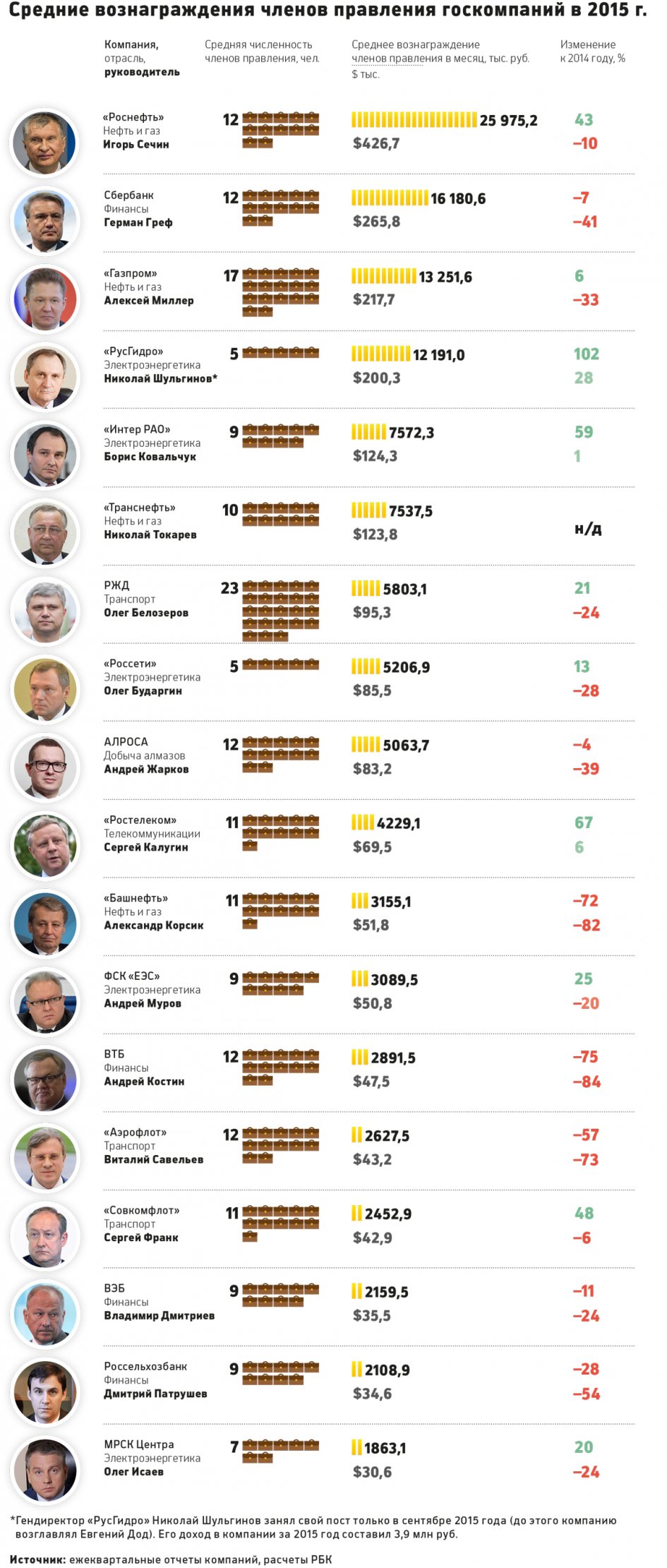 Большинство госкомпаний не раскрывают доходы своих руководителей, публикуя лишь общую сумму выплат руководящему персоналу. Среди опрошенных РБК госкомпаний («Газпром», «Роснефть», Федеральная сетевая компания, «РусГидро», «Россети», «Аэрофлот» и «Шереметьево») только в ФСК раскрыли доход председателя правления. Андрей Муров заработал в 2015 году 80,9 млн руб., из которых на премии пришлось 51,7 млн руб. Представители большинства госкомпаний сказали, что у них долгосрочные программы приняты, КПЭ топ-менеджмента учитывают реализацию программ и руководители уже несут ответственность за достижение этих целей.