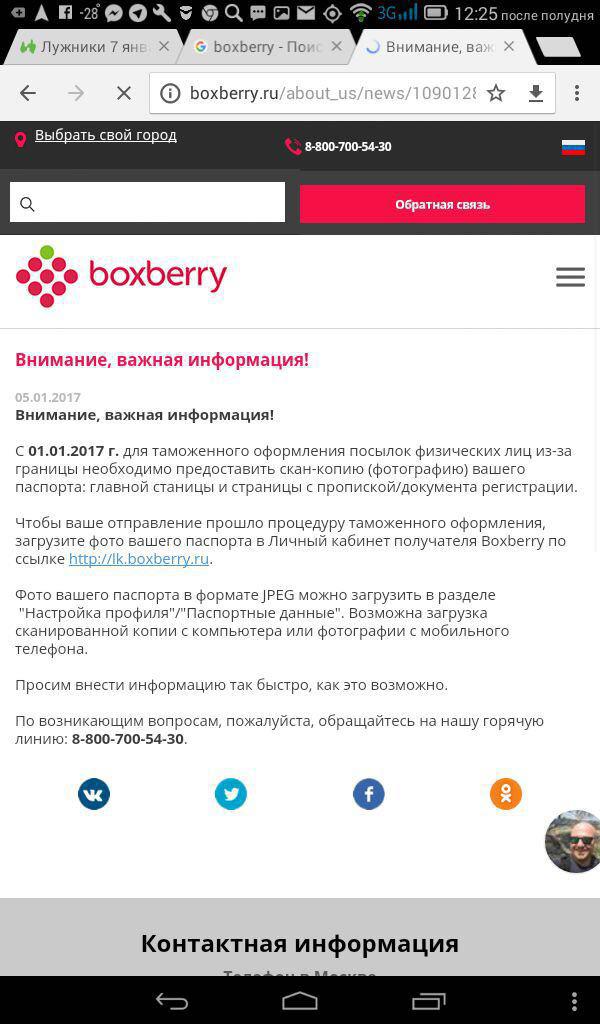 Cлужба доставки покупок из интернет-магазинов BoxBerry предупредила своих клиентов о необходимости предоставлять скан паспорта в сообщении от 5 января (сейчас сообщение удалено из архива новостей сайта). «С 01.01.2017 года для таможенного оформления посылок физических лиц из-за границы необходимо предоставить скан-копию (фотографию) вашего паспорта: главной страницы и страницы с пропиской/документа регистрации», — говорилось в сообщении. Фотографию нужно было загрузить в личный кабинет пользователя на сайте BoxBerry «так быстро, как это возможно». Связаться с представителем компании пока не удалось.