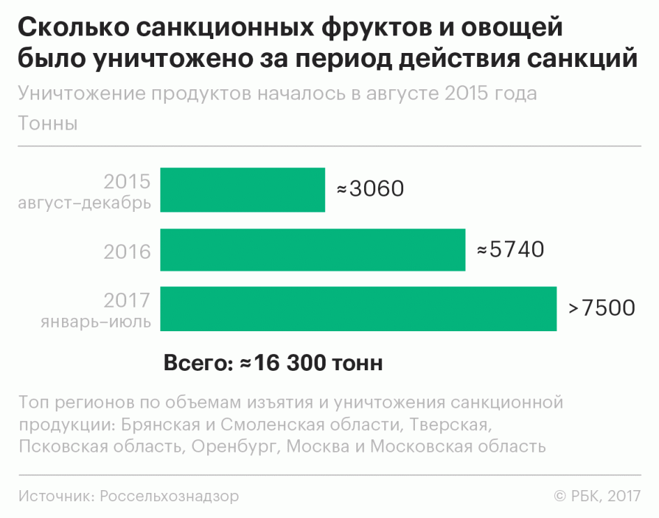 Президент России Владимир Путин 6 августа 2014 года подписал указ, запрещающий ввоз в Россию некоторых видов продовольствия из стран Европейского союза, а также из США, Австралии, Канады и Норвегии. Под запрет попали поставки говядины, свинины, мяса птицы, рыбы, морепродуктов, сыров, молока, фруктов, овощей, а также некоторых других категорий продуктов. Продовольственное эмбарго стало ответом на санкции этих стран, введенные в отношении России после присоединения Крыма. Спустя год власти приняли решение уничтожать санкционную продукцию, попадающую в Россию. Кроме того, в августе 2015 года продовольственное эмбарго было распространено также на Албанию, Лихтенштейн, Исландию и Черногорию, а с 1 января 2016 года — на Украину. В начале июля Россия продлила эмбарго до 31 декабря 2018 года.