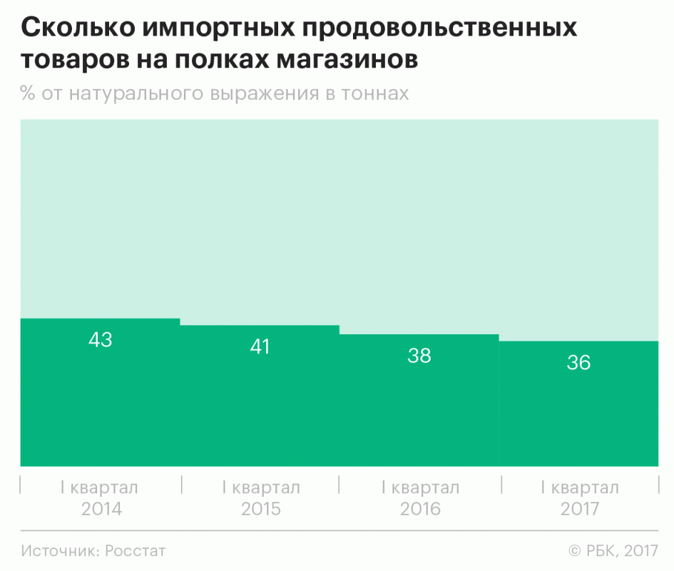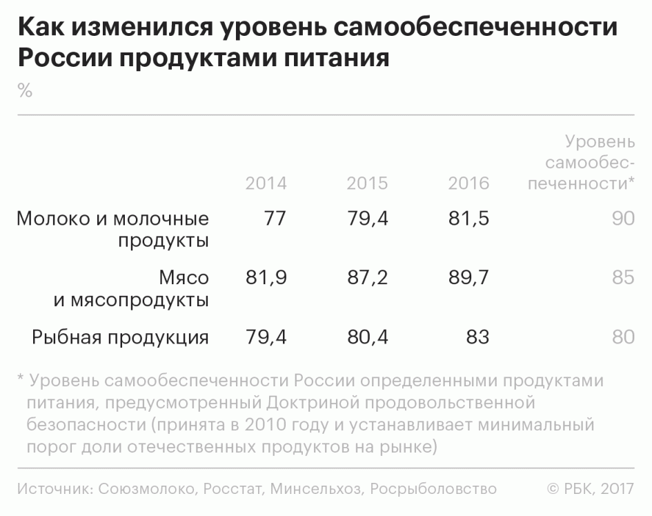 ​«На российских полках впервые за долгие годы стали доминировать отечественные продукты питания, а поставки импортного продовольствия сократились почти в два раза», — сообщил Ткачев. По данным министерства, объем поставок зарубежных продуктов по итогам 2016 года составил $25 млрд, в то время как в 2013 году, до введения эмбарго, он оценивался в $43 млрд.
