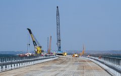Установка временного моста для технических нужд перед началом строительства Керченского моста в окрестностях порта Тамань