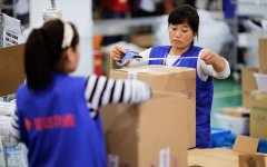 Сотрудники компании Alibaba во время упаковки товаров. Октябрь 2014 года