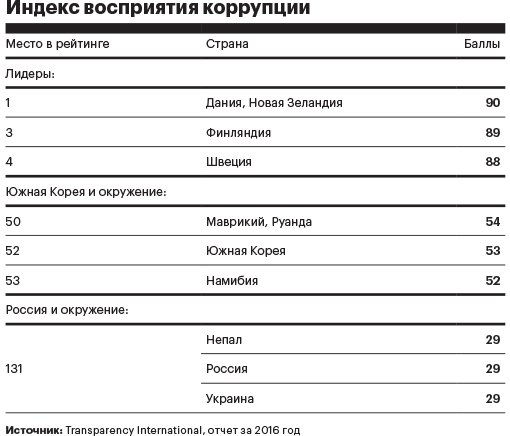 Из 176 стран в ренкинге восприятия коррупции Transparency International, опубликованном в конце января, Южная Корея оказалась на 52-м месте, между Руандой и Намибией. По сравнению с Россией на 131-м месте позиция вроде бы не такая уж плохая, но Южная Корея длительное время была одной из самых быстрорастущих экономик в мире. У оставшихся трех «азиатских тигров» обстановка с коррупцией куда лучше — Сингапур на 7-м месте, Гонконг на 15-м, а Тайвань на 31-м месте.