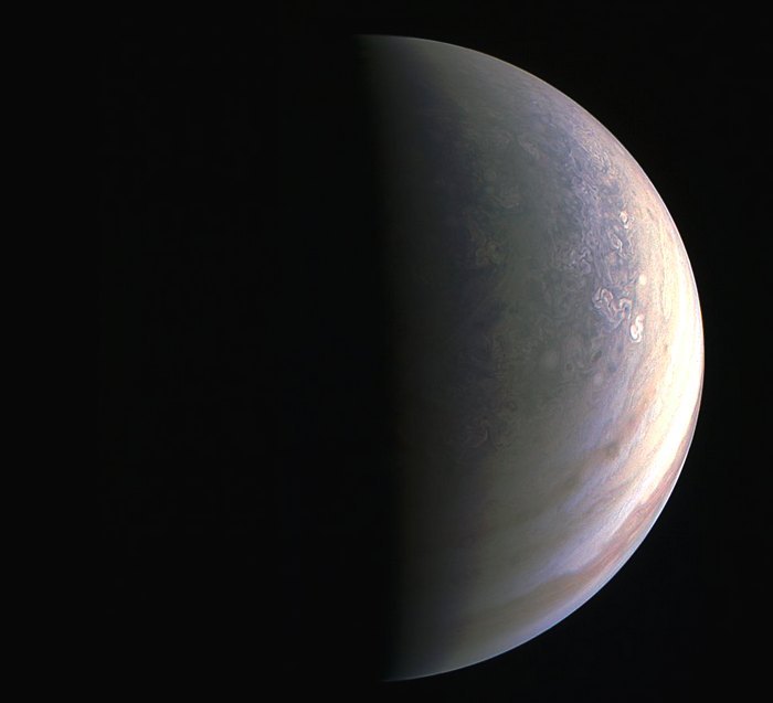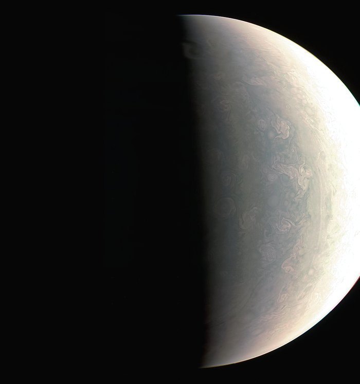 «Северный полюс оказался ни на что не похожим из того, что мы видели или даже воображали раньше. Он выглядит более синеватым, чем остальные части планеты, и на нем бушует множество штормов. Здесь нет четких полос газов, вытянувшихся вдоль линий широт и других вещей, которые являются визитной карточкой Юпитера», — рассказал руководитель миссии Скотт Болтон.